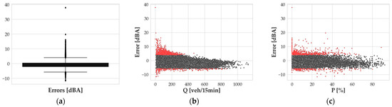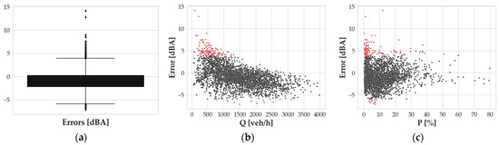 As for the graph in Figure 5b, it is clear that the outlier positive values of errors mostly correspond to a low Q value, meaning that the most significant underestimations of the model have to be investigated in periods in which uncommonly high Leq,h values are associated with a limited amount of traffic. These Leq,h values are generally related to low P values and high speeds. Such conditions suggest an expectation of values of noise levels lower than those measured (see Table A1 in Appendix A). This discrepancy can be related to several reasons; one of them could be the presence of other noise sources occurring during the measurement. Similarly, outliers corresponding to large overestimations are associated with low measured Leq,h values for the observed flows and speeds. This suggests that some specific situations, not considered in the presented model, could happen during measurements.