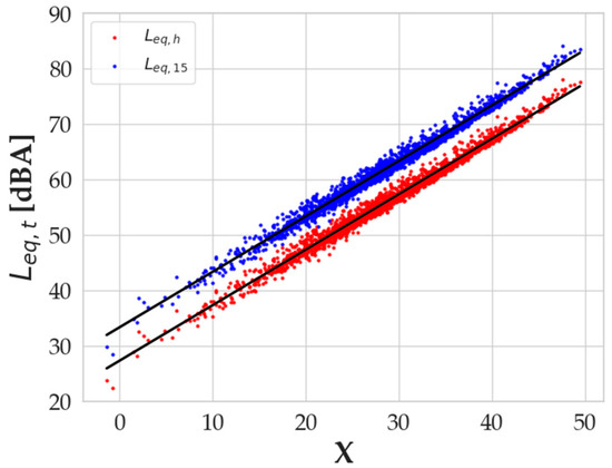 As mentioned in the previous sections, the computed Leq,h values used for the calibration of the model were obtained with a logarithmic sum where a time-dependent factor was present (1/3600; see Equation (3)). In order to change the timespan to 900 s, a different step of calibration for the model was performed, setting the time factor of Equation (3) to 1/900. The results of the multilinear regression confirm that the Leq slope lies on the coefficient of the regression, while the intercept accounts for the vertical shift in the simulations (Figure 7). The difference between the intercepts of the two regression lines is 6.02 dBA, which is exactly a result of , i.e., the conversion from 1 h to 15 min.