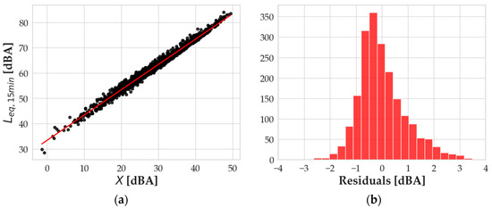 Such an interesting result strongly confirms the possibility of rescaling the computation to any desired time interval, thus adapting to whatever situation needs to be simulated. As for the comparison between the measured and simulated Leq,15min values, the authors performed the very same approach described above by analyzing the calibration residuals and the validation errors and performing a study on the model performance with and without outlier values. In Figure 8a, the linear regression of the Leq,15min values vs. the X variable is presented, while in Figure 8b, the distribution of the residuals of the calibration is shown.