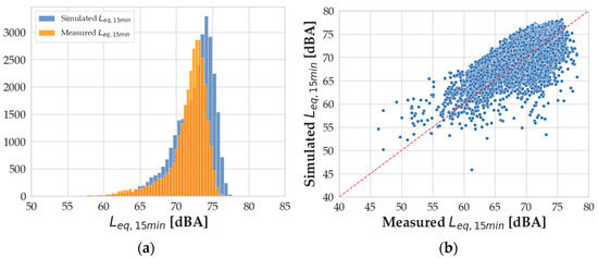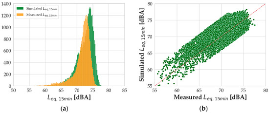 (a) Distribution of the simulated (blue) and measured (orange) Leq,15min values; (b) scatterplot of the computed vs. measured Leq,15min values.