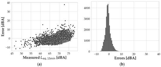 (a) Errors in the model vs. measured sound levels; (b) distribution of error values.