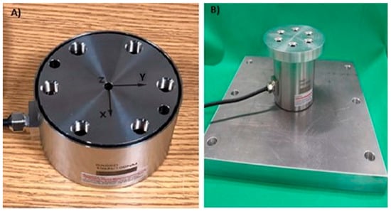 Force Sensor (FS) Model 6A68D was supplied by Interface Force Measurements Ltd. (Scottsdale, AZ, USA) (Figure 1A). The reasons why we selected this device were that (1) it is portable and easy to set in different positions and (2) the sensor can measure a wide range of forces and moments, covering the demand of this project. The FS measures the force and torque values in three-dimensional space. It is usually used in industrial and scientific applications, such as medical research (orthopedics and biomechanics). It contains three axis forces and three torques or moments of the axes (Fx, Fy, Fz, Mx, My and Mz), and thus it is called a 6-axis sensor. It measures all parameters simultaneously in three perpendicular axes and exports six-channel outputs (Table 2).