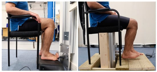 For measuring of knee muscle strengths, participants were asked to push the FS device forwards using their forefoot from a seated position with their foot on the wooden step, maintaining 90° in the knee and hip joints and the ankle joint on the natural position (Figure 4). In addition, participants were asked to push the FS, positioned under the chair, using their heel backwards in the knee joint at 90° and in the ankle joint at natural position (Figure 4). Participants were then instructed to push the FS from a seated position with 90° at the knee and hip joints and neutral position of the ankle joint downwards from motor electric adjustable height multifunction. As participants had different leg lengths, they were required to maintain the knee at 90° and to push FS in plantar flexion and dorsiflexion (Figure 5).