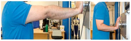 After measuring the lower limbs, the FS device was then positioned at participant elbow level and fixed to the wall. Participants were instructed in a standing position with 90° at the elbow joint and neutral position in the shoulder joint to push the FS as forcefully as possible using their hand/palm to measure hand pushing force (Figure 6 right). The FS was then moved to participant shoulder level and again fixed to the wall. Participants were instructed in standing position with shoulder flexion 90° and arm extended to push the FS as forcefully as possible using their hand/palm to measure hand pushing forces (Figure 6 left).