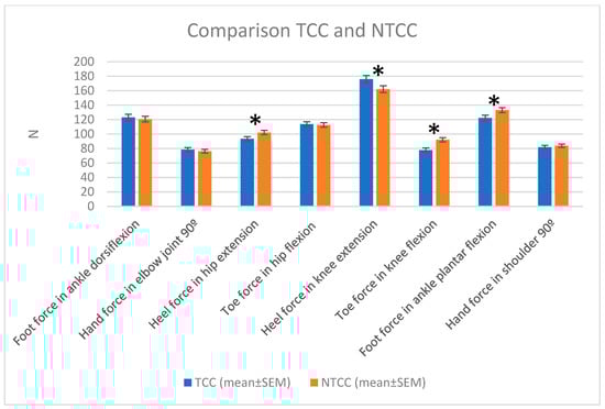 Comparison of the measured forces between TCC and NTCC groups. Note: * p < 0.05.