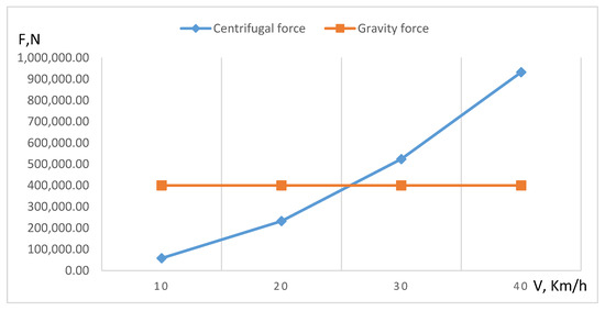 The force exerted on a vehicle was calculated. When the centrifugal force exceeds the force of gravity, the vehicle rolls over. This in illustrated in the graph of the dependence of centrifugal force on speed, shown below (Figure 3).