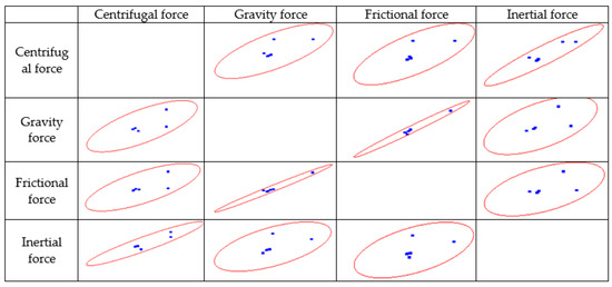 The analysis of correlations reveals that there is a strong to moderate correlation between all the studied forces (judged by the values of the Pearson’s correlation coefficient) (Table 6). A close to very strong correlation between centrifugal and inertial forces (0.93924), and gravity and frictional forces (0.99016), can be distinguished. A strong correlation is also observed between centrifugal and frictional forces (0.72439), and centrifugal and gravity forces (0.7315), while inertial and frictional forces (0.54059) and inertial and gravity forces (0.59001) demonstrate a moderate correlation.