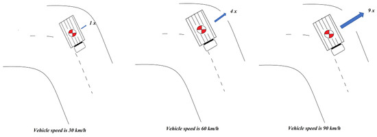 The stability of the vehicle depends on its speed. The faster the speed, the greater the braking distance, impact force and the turning radius. This means that when making a sharp turn at a speed of 30 km/h, the probability of a vehicle sliding and overturning is minimal, but if the vehicle is traveling at 60 km/h, the probability of risk increases by four times [28] (Figure 7).