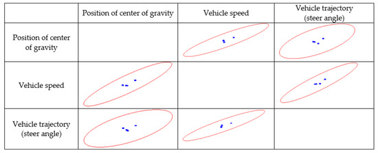 In summary, according to Pearson correlation coefficient values, a strong and moderate correlation was observed between all the investigated centrifugal force factors. A close to very strong correlation between the vehicle speed and the vehicle trajectory (steer angle) (0.91329), and the vehicle speed and the position of the center of gravity (0.89924), can be distinguished. A strong correlation was also observed between the vehicle trajectory (steer angle) and the position of the center of gravity (0.64308).