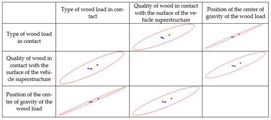 An analysis of the correlations (according to the Pearson correlation coefficient values) revealed that a close to very strong and strong correlation between all the investigated factors of friction force. There is a close to very strong correlation between the type of wood load in contact and the position of the center of gravity of the wood load (0.99665), and the quality of wood in contact with the surface of the vehicle superstructure and the position of the center of gravity of the wood load (0.90302), and a strong correlation between the type of wood load in contact and the quality of wood in contact with the surface of the vehicle superstructure (0.86487).
