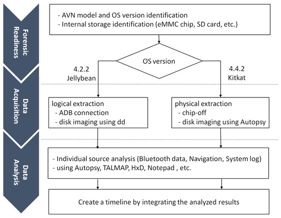This section describes the procedure for extracting and analysing data from Android-based AVN systems. After the Android OS version has been identified, the data is extracted logically or physically. Then Bluetooth data, navigation data and system logs are analysed. The artefacts found in each data source are identified and located. AVN systems from a Kia K5 (2015) and a Kia NIRO EV (2018) are investigated in Section 4.1 and a Sonata DN8 (2019) and a Kia All New Morning (2020) in Section 4.2.