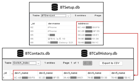 The main Bluetooth data artefacts are the MAC (media access control) address of the connected mobile devices, device name, contacts and recent call history. The MAC address of the connected mobile device can be found in BTSetup.db, BTFavorites.db, BTContacts.db and BTCallHistory.db. The target AVN systems can establish a total of five concurrent Bluetooth connections. We verified that the number of tuples of the BTDevList table is limited to five. As shown in Figure 3, the Bluetooth MAC address of the connected mobile device is stored as attribute dev#_name in the Switch_Index table of BTContacts.db and BTCallHistory.db, where ‘#’ is the index of the MAC address in theBTDevList table in BTSetup.db. For example, the MAC address of the third mobile device in the BTDevList table of BTSetup.db is also stored in attribute dev3_name in the Switch_Index table of BTCallHistory.db.