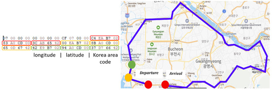 File GPSTrack.dat records the GPS information. As shown in Figure 4 (left), the coordinate information and administrative area code for each point are stored as little-endian binary numbers. For example, the coordinate information of the departure point (in red rectangles) is 45607602 (02 B7 EA C4) and 13475791 (83 A0 CD 00). Furthermore, the administrative area code of the point is 1113959228 (3C AB 65 42). The coordinate information can be converted to the longitude and latitude (GPS) using Talmap’s service. We convert the coordinate information of the points and reconstruct the position information of the car, as shown in Figure 4 (right). The coordinate information of the last point in GPSTrack.dat coincides with the coordinate information found in CurrentLoc_Table in Navi_vr.db. We can track the route of the car based on the analysis of GPSTrack.dat.