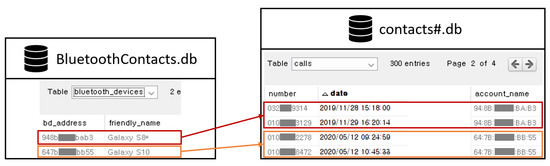 The Bluetooth MAC address of the smartphone paired with the AVN system via Bluetooth is recorded in the BluetoothContacts.db and contacts#.db files. The name of the smartphone is recorded in the friendly_name attribute in the Bluetooth_devices table of the BluetoothContacts.db file. The phonebook and favourite contacts are stored in the MC_[Bluetooth MAC address].db (e.g., MC_948bc188bab3 .db) and MF_[Bluetooth MAC address].db (e.g., MF_948bc188bab3.db), respectively. They include the given name (first name), family name (surname), and phone number of each person in the phonebook or favourite contacts. The call history is stored in the Calls table of the contacts#.db file. The table can records the phone number of a caller or receiver, and the time of the call. Through the account_name attribute of the table, the MAC address of the smartphone found in the BluetoothContacts.db file can be identified (see Figure 6). As a result, even if the AVN system is connected to several mobile devices, it is possible to identify a mobile device that has left a specific phone call log.