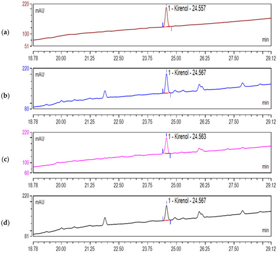 High-performance liquid chromatography (HPLC) analysis of kirenol standard (a) and the kirenol content of SPY (b), SPC (c), and SPS (d).