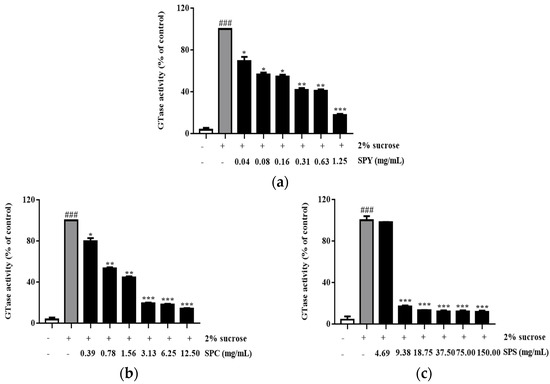 Effect of glucosyltransferase activity treated with extracts of S. pubescens: SPY (a), SPC (b), and SPS (c). The GTase activity was determined by spectrophotometry of water-insoluble glucan produced by using sucrose as a substrate. GTase was pretreated with the indicated concentration of SPY, SPC, and SPS for 24 h. Values are mean ± standard deviations (SD); ### p < 0.001 versus the non-treated group; * p < 0.05, ** p < 0.01, and *** p < 0.001 versus the 2% sucrose-treated group.