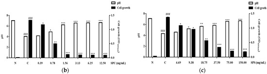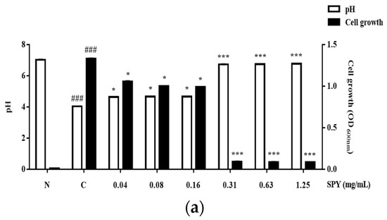 SPY, SPC, and SPS were added to Brain Heart Infusion broth with 1% sucrose, and S. mutans was inoculated at 1 × 106 CFU/mL. After incubation under anaerobic conditions at 37 °C and 24 h, the pH was measured using a pH meter (Hanna Instruments Ltd., Woonsocket, RI, USA) to observe the effect of inhibiting acid production, and cell growth was measured using a UV/VIS spectrophotometer (Mecasys Co., Ltd., Daejeon, Republic of Korea).