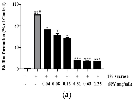 Effect of biofilm formation inhibition treated with extracts of S. pubescens: SPY (a), SPC (b), and SPS (c). Biofilm formation from SPY, SPC, and SPS in S. mutans including 1% sucrose, and incubation for 24 h; the rates of biofilm formation rates were measured with a microplate reader. Values are mean ± SD; ### p < 0.001 versus the non-treated group; * p < 0.05, ** p < 0.01, and *** p < 0.001 versus the 1% sucrose-treated group.