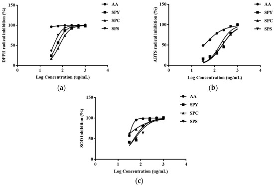 DPPH, ABTS, and SOD-like antioxidation activities of SPY, SPC, and SPS: DPPH radical scavenging (a), ABTS+ cation scavenging (b), and SOD-like activity (c). Ascorbic acid was used as a positive control. Data are expressed as the mean ± SD of the results of three replicates.