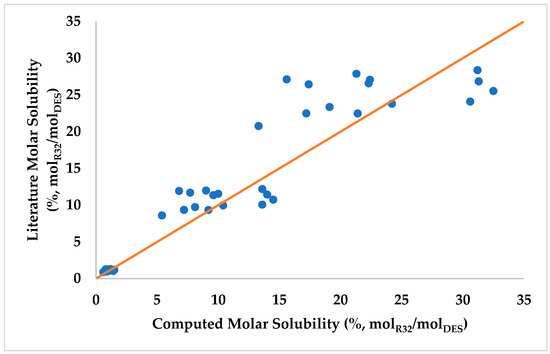 The predicted solubility of R-32 in DES is produced through Equation (4).