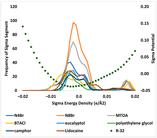 Figure 2 contains the sigma profiles for the studied DES components following the primary y-axis. The x-axis is the sigma segment charge while the primary y-axis is the frequency of the segment on the molecule. The secondary Y-axis is the chemical potential of difluoromethane when interacting with specific charged surfaces represented on the x-axis, which are represented as a dotted line. Negative chemical potential values correspond to energetically favorable interactions between difluoromethane and a given surface charge. It is evident that the difluoromethane prefers to interact with van der Waals and hydrogen bond accepting surfaces. The parabolic nature indicates repulsion from sufficiently negative or positively charged surfaces with a hydrophobic attribute [23]. The sigma profiles of the HBA and HBD all show large peaks in the non-polar region, with varying peak tail areas in the polarized segments (<−0.0078 e/A2, >0.0078 e/A2) [36]. This is expected due to the hydrophobic nature of type 5 DES which these components comprise. This compliments the difluoromethane interaction preferences, which explains the relatively low ln activity coefficient values witnessed for all solvent combinations as discussed earlier. However, the defining property for why N4Br, N8Br, BTACl, and MTOA outperformed the other HBA lies in the surface charge distributions. The four studied HBD (eucalyptol, polyethylene glycol, camphor, and lidocaine) are also included in Figure 2 and are represented as having remarkably similar sigma profiles to each other.