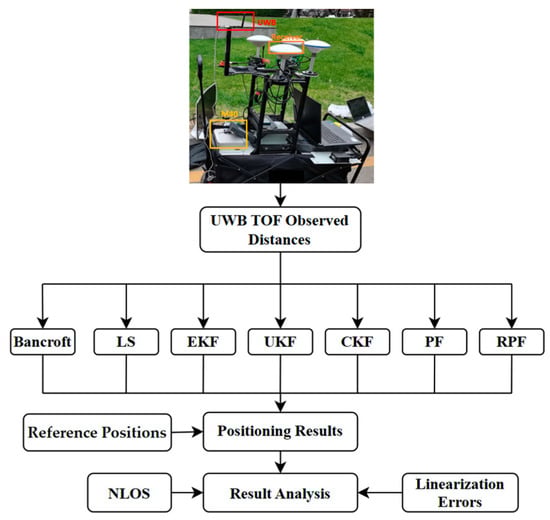 Based on the above models, the proposed UWB algorithm can be simply presented in Figure 1. Firstly, use eight LinkTrack P base stations (https://www.nooploop.com/en/. accessed on 9 May 2023) to collect the distance between each base station and the tag. Then, seven algorithms, namely Bancroft, LS, EKF, UKF, CKF, PF, and RPF, were used to calculate the positions of the tag. Finally, the impacts of NLOS errors and linearization errors on the UWB positioning accuracy were analyzed using indicators such as RMSE, CDF curve, and running time of different algorithms.