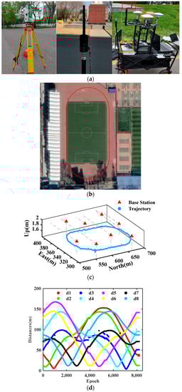 (a) Part of the used equipment; (b) the trajectory of the field test; (c) UWB base station distribution; (d) time-series of observed distances.