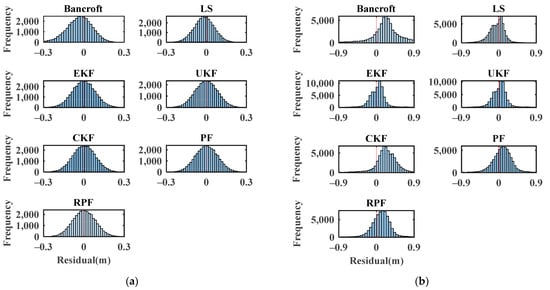 Residual histogram of UWB data in the simulation experiment (a) and these in the field experiment (b).