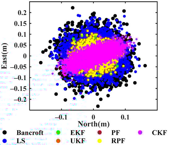 Table 5 lists the running time of the seven algorithms to complete the data processing. In general, the running time for the linearization estimation methods such as LS and EKF was much shorter than these of the nonlinearization filters (i.e., UKF, CKF, PF, and RPF). Even for the same type of estimation methods, the running times were also different. For example, the running times of LS and EKF were different. This was because a time-update phase was needed in EKF. Meanwhile, the CKF algorithm presented higher execution efficiency and less running time than the other nonlinearization filters, which was due to the fewer iterations. In general, RPF costs more running time, with about 16.4 times, 20.5 times, 6.5 times, 2.3 times, 3.6 times, and 1.3 times than that of Bancroft, LS, EKF, UKF, CKF, and PF, respectively.