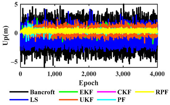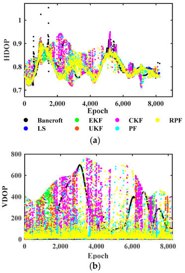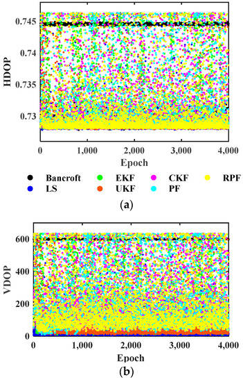 Figure 4 and Figure 5 show the position error in horizontal and vertical in terms of scatter diagrams and time series, which were calculated by the seven adjustment algorithms (Bancroft, LS, EKF, UKC, CKF, PF, and RPF) based on the simulated UWB data. It can be seen that the position errors of the seven algorithms in horizontal (centimeter level) were much lower than those in vertical direction (meter level). This was majorly caused by the geometry distribution between eight base stations and tag. As shown in Figure 6, the HDOP values (0.73 on average) were much smaller than the corresponding VDOP (184.05 on average). Additionally, since only Gaussian noises and no NLOS errors were added in these simulated data, the position differences presented in the results can reflect the real performance of different adjustment methods directly. Accordingly, the Bancroft algorithm had the worst solutions because it solved the results of nonlinear system in non-optimal in the statistical properties. The results from the other algorithms were higher accuracy. Because the criteria of minimizing the squared observation-residuals and minimizing the squared parameter-residuals [46] were used to find the optimal solutions. Meanwhile, the position errors caused by linearization errors in both LS and EKF can be eliminated while using the UKF, CKF, and PF. Additionally, since only Gaussian noises and no NLOS errors were added in these simulated data, the robust algorithm in Equation (16) could not be activated. Therefore, it can be seen that no more position improvements can be obtained while using the RPF compared to that of PF.