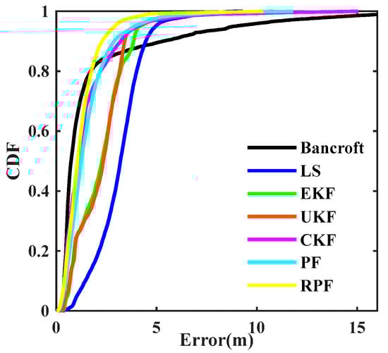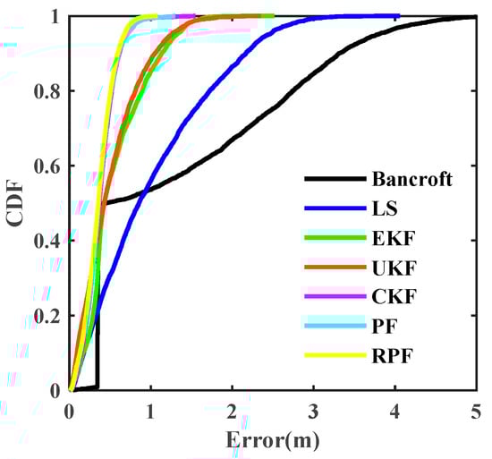 Figure 7 shows the cumulative distribution function (CDF) of position errors of the seven positioning algorithms. It can be seen that the CDF of RPF, PF, and CKF have the highest probability in three-dimensional positioning error under the same threshold value. According to the CDF values of the localization error in Figure 7, at the percentage of 50%, 3D position errors for the Bancroft, LS, EKF, UKF, CKF, PF, and RPF were less than 0.43 m, 0.85 m, 0.42 m, 0.42 m, 0.37 m, 0.36 m, and 0.35 m, respectively. These values on the percentage of 68% for the Bancroft, LS, EKF, UKF, CKF, PF, and RPF were 2.07 m, 1.32 m, 0.65 m, 0.62 m, 0.45 m, 0.44 m, and 0.43 m, respectively. While setting the percentage to 95%, the 3D position errors for the seven algorithms were 3.77 m, 2.43 m, 1.32 m, 1.25 m, 0.69 m, 0.71 m, and 0.67 m. Since only Gaussian noises were added in these simulated UWB distances, it indicates that the truncation errors would degrade UWB position accuracy significantly, with a percentage of 13.6%, 16.3%, and 40.3% in the north, east, and vertical directions on average.