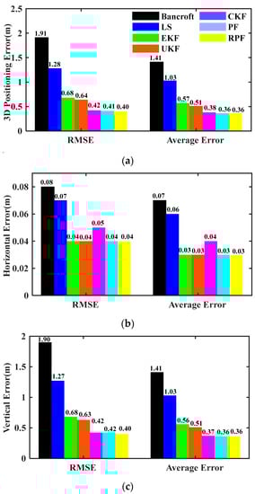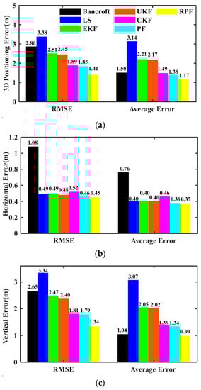 Figure 8 shows the statistical results of position errors in terms of RMSE and average error. Comparing the horizontal positioning error in Figure 8b with the three-dimensional positioning error in Figure 8a, it can be seen that the RMSE of UWB positioning accuracy in horizontal was about 0.03 m~0.08 m, which was much higher than that in the vertical direction (0.36 m~1.91 m). Here, the 3D positioning RMSE of Bancroft, LS, EKF, UKF, CKF, PF, and RPF were 1.91 m, 1.28 m, 0.68 m, 0.64 m, 0.42 m, 0.41 m, and 0.40 m, respectively. Statistically, the RPF produced position accuracy improvements with percentages of 79.1%, 68.8%, 41.2%, 37.5%, 4.7%, and 2.4% to the solutions of Bancroft, LS, EKF, UKF, CKF, and PF, respectively. Additionally, the nonlinearization filters including UKF, CKF, PF, and RPF performed much higher accuracy than EKF and LS. It was because the nonlinear UWB positioning system needs to be linearized by using Taylor expansion which lead to the second-order and higher-order items being ignored. Such truncation errors could reduce positioning accuracy.