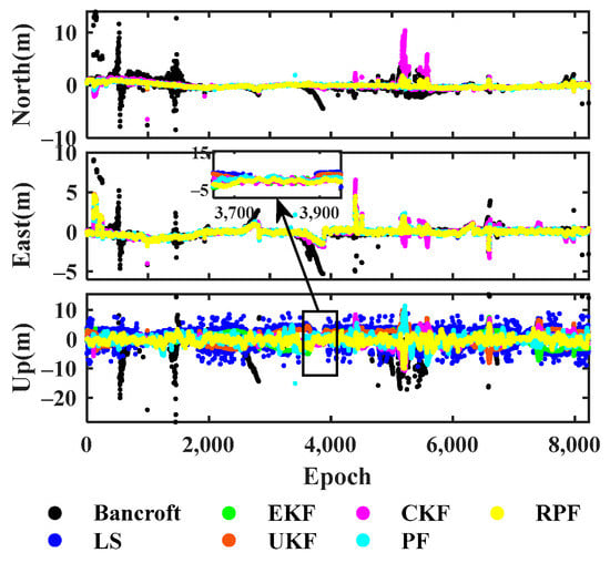 Figure 12 shows the statistical results of UWB position errors in horizontal and vertical components of the seven algorithms in terms of RMSE and average errors, respectively. Similar to the simulation results, the horizontal positioning accuracy was much higher than the vertical positioning accuracy. Meanwhile, solutions from UKF and CKF were more accurate than that of EKF. This was because UKF and CKF acted as definite sampling filtering algorithms. While dealing with nonlinear system, sigma point sets were generated according to the sampling strategy based on the mean and covariance of the system state prior probability density. Therefore, it did not need to linearize UWB observation equations leading to no linearization errors. Meanwhile, the Jacobi matrices will not be needed during filtering algorithm iteration. However, the principle of avoiding linearization for UKF and CKF is different. For UKF, it is realized by computing the approximation term of the probability statistical eigenvalues of the nonlinear equation instead of ignoring the higher order term of the nonlinear equation after Taylor expansion [47]. The CKF is based on the theory of numerical integration and approximates the Gaussian integral by using the third-order spherical radial volume criterion [48]. Therefore, CKF is more rigorous and stable than UKF in theory. The statistical results in Figure 12 prove it visibly. For the least square method, it avoids the explicit inversion of the matrix, and guarantees the symmetry and positivity of the covariance matrix. It can be seen from Figure 12a that the 3D positioning RMSE values of Bancroft, LS, EKF, UKF, CKF, PF, and RPF were 2.86 m, 3.38 m, 2.51 m, 2.45 m, 1.89 m, 1.85 m, and 1.41 m, respectively. Compared with the solutions of Bancroft, LS, EKF, UKF, CKF, and PF, RPF upgraded the position accuracy by 50.7%, 58.3%, 43.8%, 42.4%, 25.4%, and 23.8%, respectively. This indicates that the truncation errors would degrade UWB position accuracy significantly, with the percentages of 2.5%, 3.9%, and 26.1% in the north, east, and vertical components on average. Such accuracy-decrease rates caused by NLOS error were 6.1%, 5.2%, and 25.1% in the three directions. Therefore, when UWB ranging distance contained NLOS errors, the robust algorithm in RPF can remove the impact of NLOS on UWB position accuracy. Table 6 lists the running times required for the seven algorithms. It can be seen that the RPF algorithm took the most time, which was about 18.4 times, 8.9 times, 8.2 times, 2.3 times, 3.8 times, and 1.1 times more than that of Bancroft, LS, EKF, UKF, CKF, and PF, respectively. This conclusion is consistent with the results from the simulation experiment.