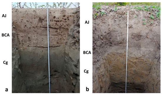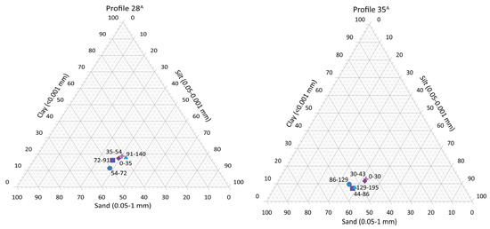 Data on soil particle distribution are given in Table 2. The soil investigated belongs to the loamy or sandy loam class according to the texture tringle (Figure 3). Fine particle content is increased in topsoils in comparison to middle and deep soil horizons. It could be the result of colmatage (accumulation of fine particles in the topsoil from turbid water with suspended matter) [37].