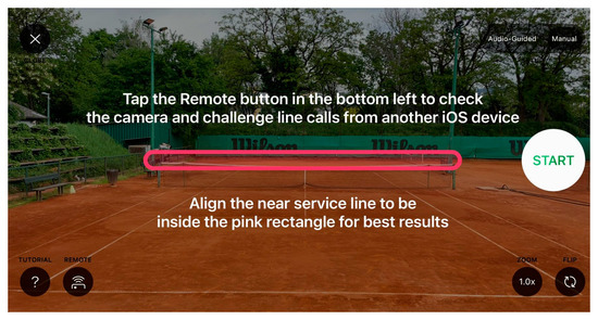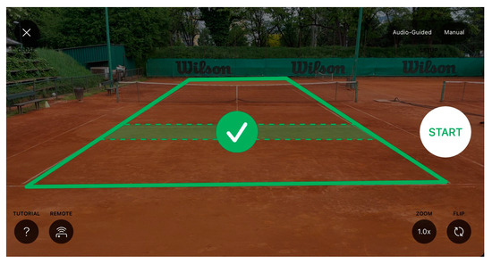 The testing procedure was conducted on an outdoor clay court. Weather conditions during testing were typical for the summer part of the tennis season on a clay surface. The test was conducted in the morning hours, and the temperature was 26 degrees, with no wind. Prior to the start of the measurement, the participants performed a standardized 20 min warm-up consisting of basic (off-court) and specific (on-court) tennis warm-up drills. After finishing the warm-up protocol, the players were instructed to serve 60 times (30 on the deuce side and 30 on the advantage side). Overall, 150 serves were observed on each serving side. The participants were instructed to serve the first serve anywhere in the service box, as they would serve during a competitive match. Upon the completion of the serving procedure, players were asked to play a training match. The first 100 shots (overall 500 shots) played were used for further analysis to determine SV validity. The observed shots in terms of the type of strokes consisted of forehand, backhand, serve, forehand volley, backhand volley, and overhead shot. Strokes in terms of spin type consisted of a kick serve, as well as slice, flat, and topspin shots. A kick serve is performed by generating a significant amount of topspin by hitting up on the ball and snapping the wrist when contacting the ball. Slice shots are characterized by adding sidespin with a low bounce of the ball after hitting the ground. Flat shots are hit without spin and are characterized by the high speed of the ball. Lastly, for topspin shots, it is necessary to swing up and brush the back of the ball when making contact. Before starting the SV application, attention should be paid to the correct placement of the mobile phone. It is recommended to place the mobile phone high enough that a few feet behind each baseline is visible. and that the top of the net does not overlap with the far service/baseline. Furthermore, for optimal accuracy, it is recommended to zoom in as close to the court while still keeping all corners of the singles court visible on screen. The phone was placed on the mount at 3 m height on the fence. The position was calibrated and aligned with the use of in-built software calibration, as presented in Figure 1 and Figure 2.