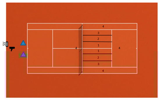 According to manufacturer instructions, radar settings were set at range 4, with low speed set to 70 km/h and high speed set at 250 km/h to avoid unnecessary movements around the court. Speed was measured on serve behind the player at the level of impact on the ball. The service box was divided into three equal zones from the “T“ line to the wide line of the service box. Each zone was 1.37 m wide (Figure 3). A fourth zone represented missed shots (net or outside the service box). The server position from the deuce and advantage sides on the baseline was displayed (Δ). A video camera (Panasonic Lumix DC-GH5 II) was placed next to the service box that recorded every contact of the ball with the surface after the service. The authors of this paper used this camera to record the location of the contact of the ball with the surface and compared it with the recorded video via the application (Figure 4). For the additional verification of the actual point of contact, the ball’s bounce was assessed on the court after each serve, checking its trace, and this was possible because the test was conducted on a clay surface, and thus the ball left a clear mark on the surface upon contact.