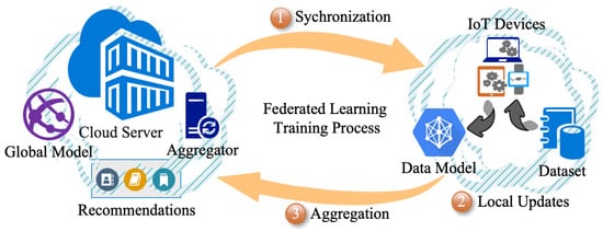 - Cloud server: A cloud server is an entity in an FRS that stores user information and makes recommendations for other users [33]. The cloud server is responsible for collecting data from multiple sources, processing them, and making recommendations. It also is a hub for other participating entities, such as individual users, content providers, and recommendation systems. By connecting these entities, the federated server can provide more accurate and personalized recommendations to users [34].