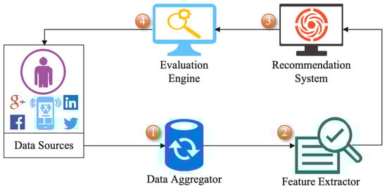 - Evaluation engine: This component measures the system’s performance, such as user engagement, user satisfaction, and other metrics [42]. The evaluation engine collects and analyzes data from different sources and uses machine learning algorithms to identify patterns in the data and evaluate the system’s performance. It also provides feedback to the other components in the system, such as the content providers, to enable further optimization [43,44]. The evaluation engine ensures fairness and accuracy in the system.