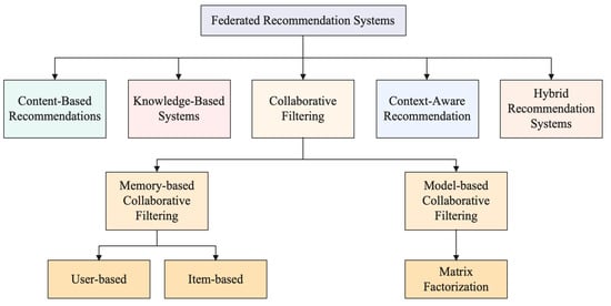 - Hybrid recommendation systems: Hybrid recommendation systems are a type of FRS that combine the capabilities of traditional centralized and distributed recommendation systems to provide users with the best of both worlds [3]. Hybrid recommendation systems enable users to make use of personalized recommendations while also protecting their privacy. In a hybrid system, the data are stored in a central repository, and the recommendation algorithm is executed by a federated learning system [69]. The central repository stores all of the user’s profile data, and the federated learning system executes the recommendation algorithm without any user data being shared between the two. This allows the system to remain secure and the user data to remain private. Besides, the hybrid system allows different algorithms to be used. For example, collaborative filtering can be used in conjunction with content-based filtering to provide a more accurate recommendation [70]. Furthermore, the system can be adapted to different data sources, such as social media and web analytics. This type of system also has the advantage of scalability. As new users join the system, the recommendation algorithm can be updated without requiring additional user data to be shared [71]. This makes the system more efficient and effective and allows for more users to be accommodated. The primary privacy concern with hybrid recommendation systems is the extensive collection of user data from various sources required to make accurate and diverse recommendations. These data can include sensitive user behavior, profile, and contextual data, which if not properly protected, can lead to unauthorized access and unintended disclosure of personal information. Thus, such systems must prioritize the implementation of robust privacy-preserving techniques, such as data anonymization, homomorphic encryption, and differential privacy, to mitigate the risks of data breaches and ensure that user privacy is not compromised.