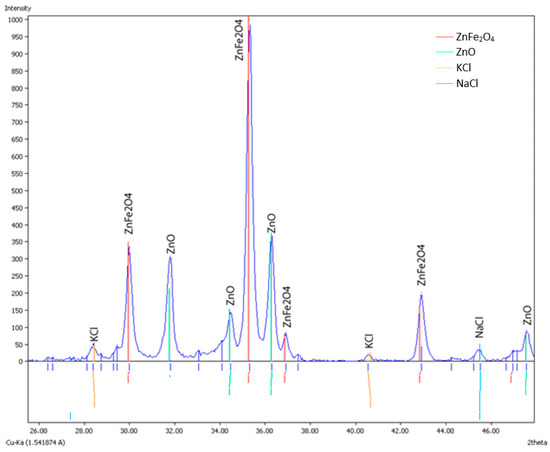 The iron distribution throughout iron-containing phases in EAFD samples was studied by X-ray phase analysis on a DRON-3.0 diffractometer (JSC Scientific production enterprise “Burevestnik”, Saint Petersburg, Russia). It has been established that the dust contains valuable components in the form of ZnFe2O4 and ZnO (Figure 3) [27].