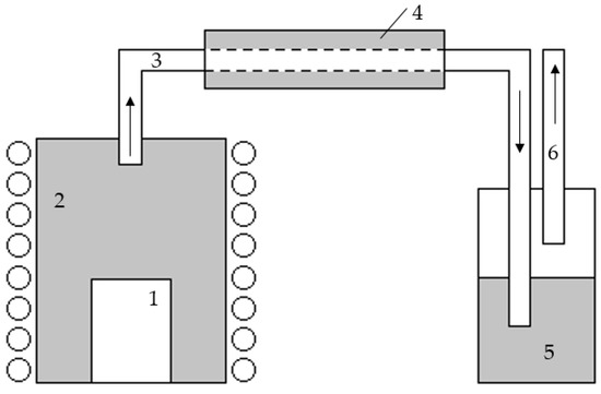 Laboratory EAFD processing unit: 1—crucible with charge; 2—furnace; 3—flue; 4—water-cooled jacket; 5—water trap for dust; 6—vacuum pump.