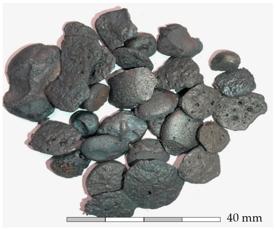 The reduction melting of the pelletized charge formed slag granulated pig iron. Shock cooling of this product in water leads to the instantaneous crystallization of iron particles and their separation from the slag. The granulated pig iron particles obtained (Figure 6) were 10–15 mm in size and had magnetic properties. The extraction of iron into pig iron was 92–96%.