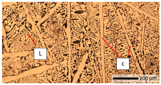 The pig iron sample metallography results (L—ledeburite; C—cementite primary).