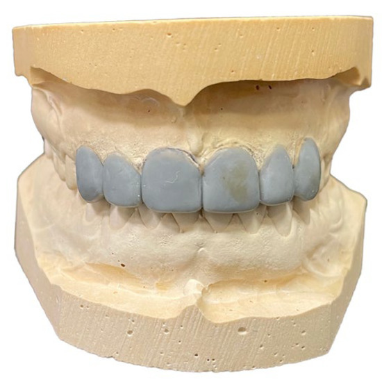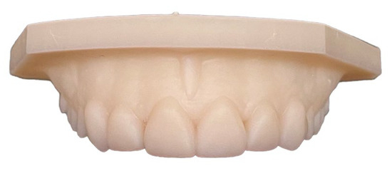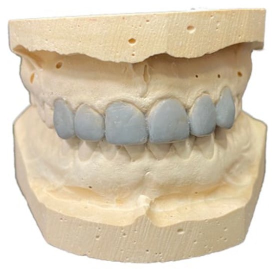 The dental casts were used by a dental technician to obtain a dental wax-up without any precise measurements and proportions of the elements given by the clinician. Thowax Yeti Ref. 714-0000 gray wax (Yeti Dental GmbH, Engen, Germany) was used to produce the modified anterior teeth according to the opinion and competence of the dental technician (Figure 3).