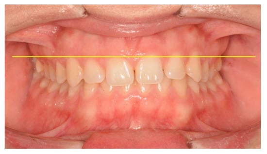 Dental evaluation performed on the frontal photograph of the patient’s smile in maximum intercuspation with cheek retractors (horizontal yellow line).