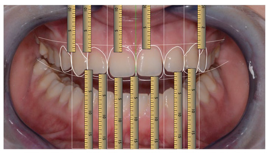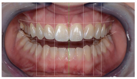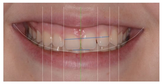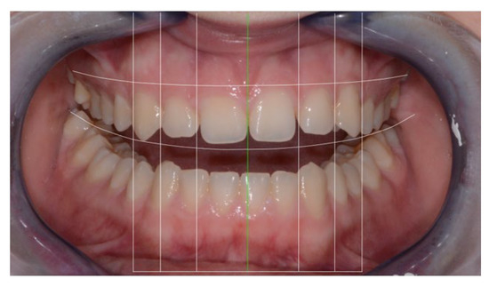 A template of six round-shaped teeth produced in Adobe Photoshop® CS6 (Adobe, San Jose, CA, USA) [24] was placed inside the grid, with the central incisors and canines touching both upper and lower lines and the lateral incisors not touching both lines (Figure 11).
