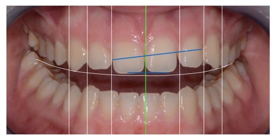 Two blue lines were traced, one between the two central incisors at their incisal edge and the other along the apex of the papillae between elements 1.2–1.1 and 2.2–2.3 (Figure 8). The third reference line was the green one, corresponding to the median line.