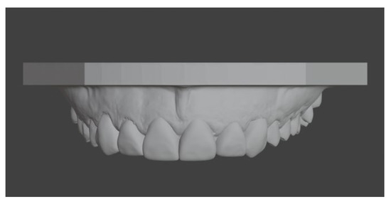 The digital file was converted in the Preform software (version 2.20.0, Formlabs, Somerville, MA, USA) to obtain a digital print of the modified dental model. The 3D model was printed with a Formlabs 3B printer (Formlabs, Somerville, MA, USA) with Model V3 resin (Formlabs, Somerville, MA, USA) on a printing plate, without a tray, at 0° and with a vertical resolution of 0.1 mm (Figure 16).