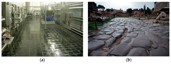 It is also very interesting to remember that basaltic natural blocks were applied as pavements in the Roman Empire more than two millennia ago (as is shown in Figure 1b). Many medieval squares and streets in Naples, Rome and other sites in Italy are covered with large natural basaltic tiles or cobblestone. Even today, different companies continue successfully to produce similar natural materials.