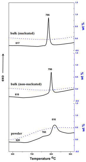 The DTA method is also widely used to estimate the crystallization tendency (i.e., bulk or surface). In this case, the ability for bulk nucleation and growth is evaluated by a simple comparison of the DTA runs of bulk and fine powder samples. At a satisfactory tendency for bulk crystallization, the Tp of the bulk sample can be similar to that of the powder sample. To the contrary, when the tendency for bulk nucleation is scarce, the crystallization exo-peak is larger, with lower intensity, and it appears at a higher temperature.